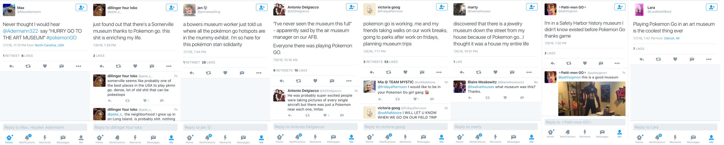 Searching “PokémonGO” and “Museum” on Twitter has dozens of people posting about visiting a local museum, often for the first time. Most of these people have even entered the museum and walked around the exhibitions. In large museums, Pokemon will “live” in one wing, so players are on the look out for each other to provide helpful hints (There are multiple stories online today about people becoming real life friends through Pokemon quests. Sherry Turkle, what do you have to say to that?).